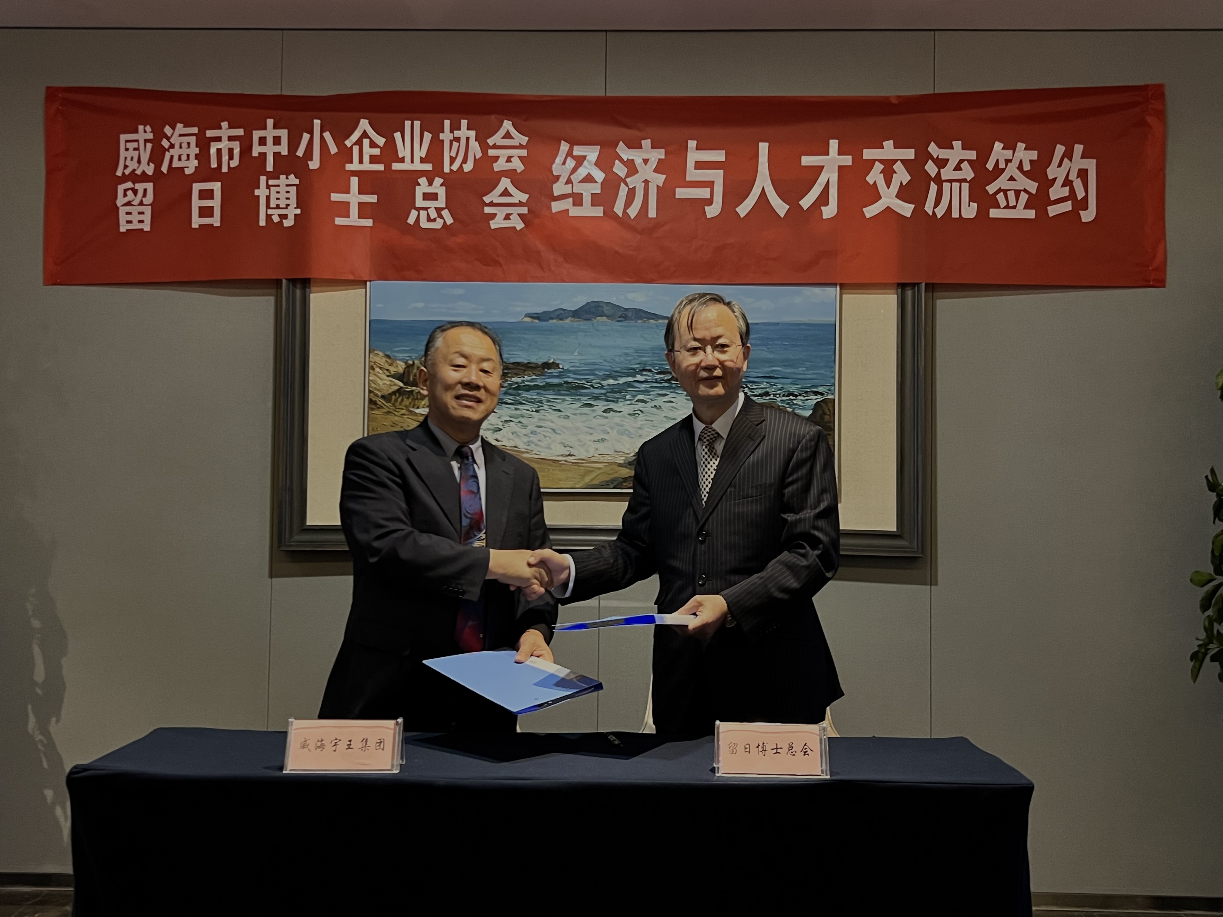 雙方順利達成合作意向并于下午5時許簽訂《威海市宇王集團有限公司與留日博士總會合作框架協(xié)議》,雙方將在海洋生物、水產(chǎn)養(yǎng)殖、食品加工、海洋裝備方面建立長期合作交流,強化產(chǎn)學(xué)研全面合作,共同推動海洋經(jīng)濟邁上新臺階,揚帆起航正當時,雙雄攜手鑄輝煌!